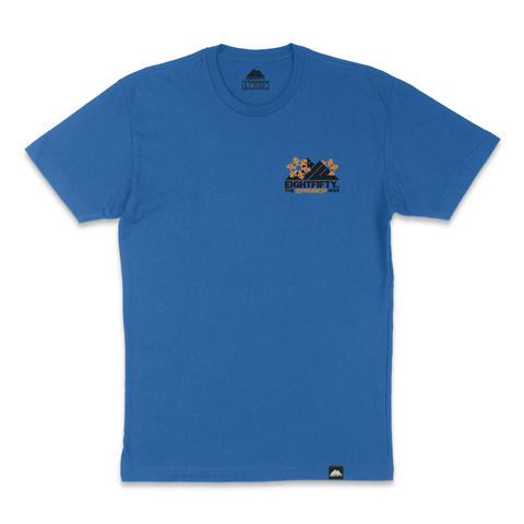 On the front, we feature our new collab logo. This 3-color print has a white base layer under the orange to make it stand out on the turquoise blue tee. Printed in black, we have our EightFifty Co. logo with Sierra orange snowflakes intertwining. Under the logo, it says “The Sierra Winter Way” with Sierra’s name in orange.