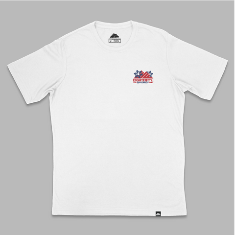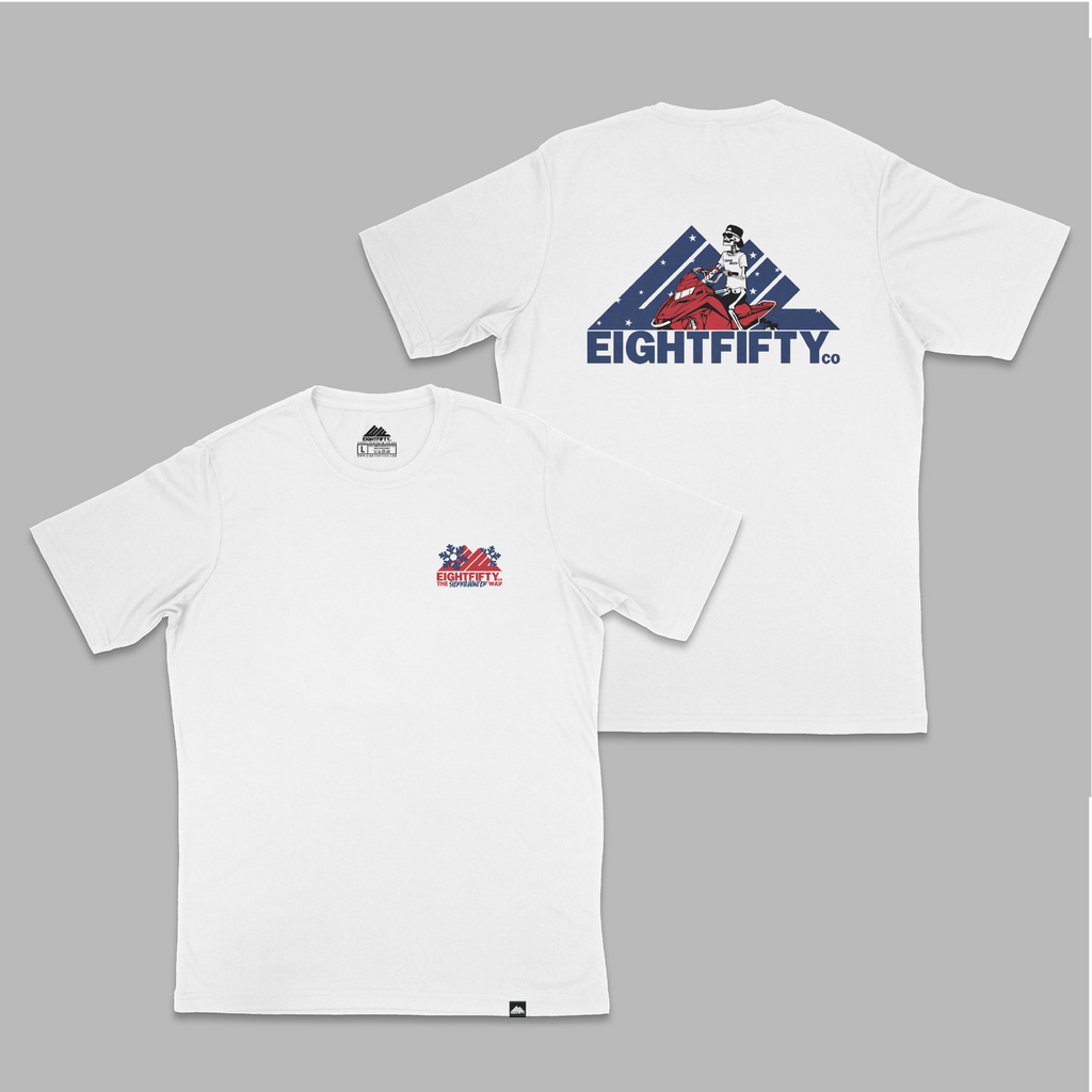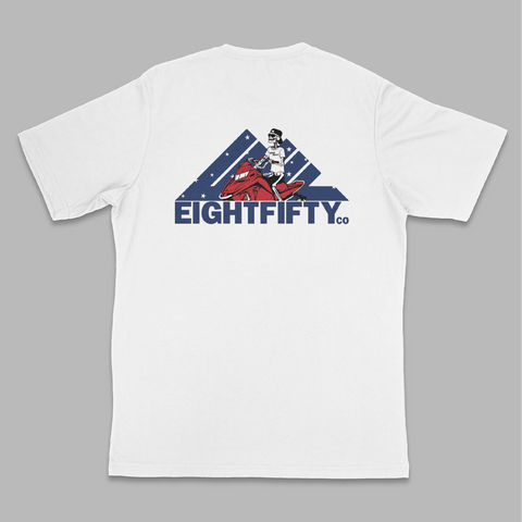 On the back, there’s a detailed 3-color print featuring a skeleton riding a red snowmobile. The skeleton is wearing a white Sierra Winter T-shirt, a black and red backwards trucker hat, and a pair of EightFifty Co. sunglasses. Behind Skelly, a blue EightFifty Co. logo filled with stars brings a patriotic vibe to the design. All the fine details of the skeleton and snowmobile are printed in black.